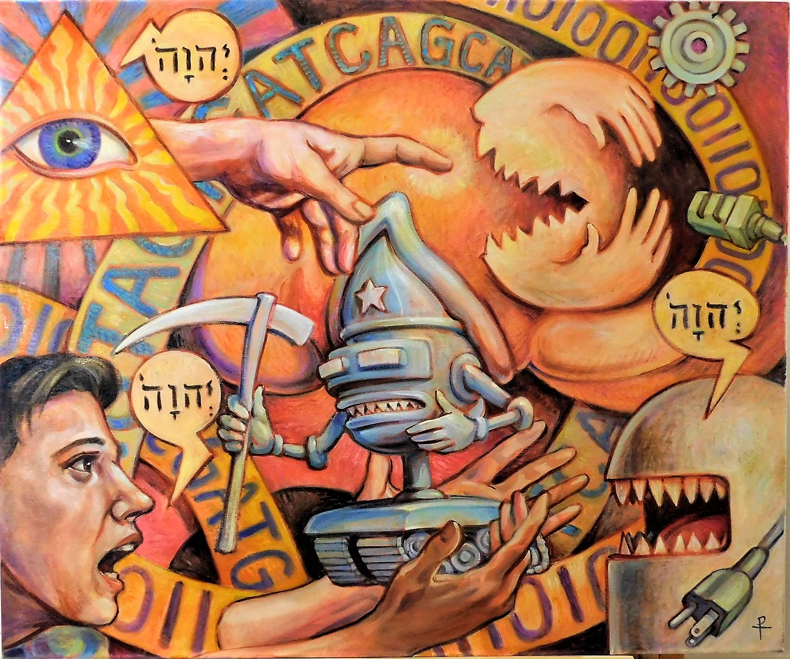 Deicide - God, man and machine all saying they are god (see Hebrew text boxes)! God's finger pointing (like in famous Cistine Chapel ceiling) to man who is biting the hand that feeds it. God made man and man made machine. Created denies Creator.