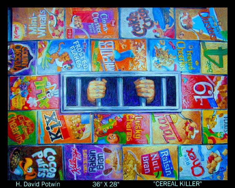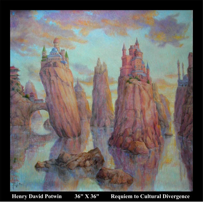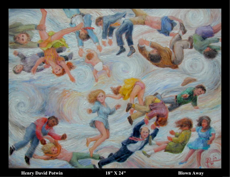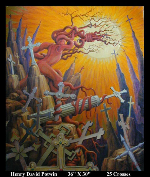 25 Crosses - is a very personal painting for the artist. Each cross represents one year of Potwin's prison sentence. The man-tree is trying to move ahead but rooted in the rubble of his life- the chasm of past and future- the various implications of the cross: torture, moral judgement- the crisis of personal suffering. Yet, the single leaf at the tip of the man-tree represents life, hope- salvation.